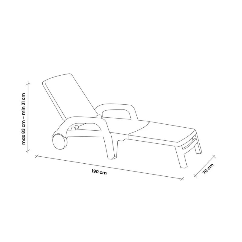 Elegantais sauļošanās krēsls Riva garantēs ērtu, mierpilnu un relaksējošu atpūtu. Viens no pieprasītākajiem modeļiem profesionālajā sektorā peldbaseinu, atpūtas zonu vai solāriju ierīkošanai. Atzveltnes leņķi ir iespējams regulēt jums nepieciešamajā stāvoklī, to var regulēt atbilstoši vēlmēm un aktivitātēm. Sauļošanās krēsls Riva ir izgatavots no augstas kvalitātes otrreiz pārstrādājama polipropilēna un stikla šķiedras kombinācijas, izmantojot injekcijas liešanas tehnoloģiju, kas piešķir tam lielu izturību ikdienas lietošanā un noturīgumu pret nelabvēlīgiem laikapstākļiem. Sauļošanās krēsls ir aprīkots ar riteņiem, kas padara to viegli pārvietojamu. Ziemā sauļošanās krēslu vēlams uzglabāt iekštelpās vai izmantot pārsegu, kas palīdz pagarināt krēsla kalpošanas laiku un nodrošina aizsardzību pret skarbajiem laikapstākļiem. Būtisks papildus elements – krēslus var salikt vienu virs otra, kas uzglabājot aizņem maz vietas. Sauļošanās krēsla izmēri: 190 x 72 x 60 cm Neto svars: 10,2 kg - Kvalitāte un dizains - 100% ražots Itālijā