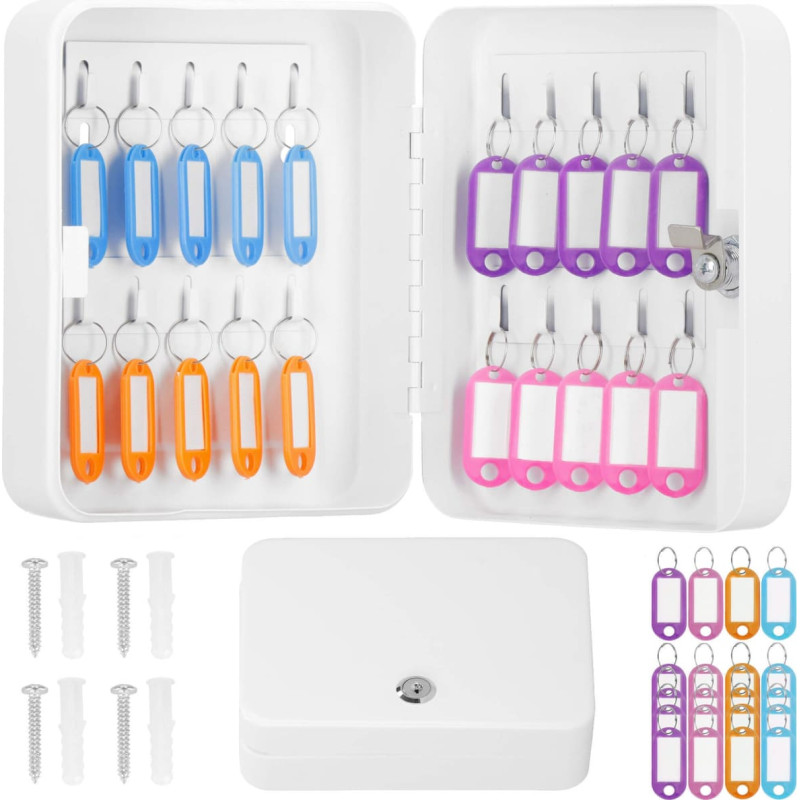 Karbivärv: valge Võtmehoidjate värv: mitmevärviline (segu) Materjal: teras Viimistlus: matt Lukustussüsteem: võtmega Võtmekonksude arv: 20 Võtmehoidjate arv: 20 Komplektis olevate võtmete arv: 2 Komplektis: Võtmekarp Võtmehoidjad – 20 tk Kinnitusdetailid Mõõdud: Laius: 20 cm Sügavus: 16 cm Kõrgus: 7,5 cm