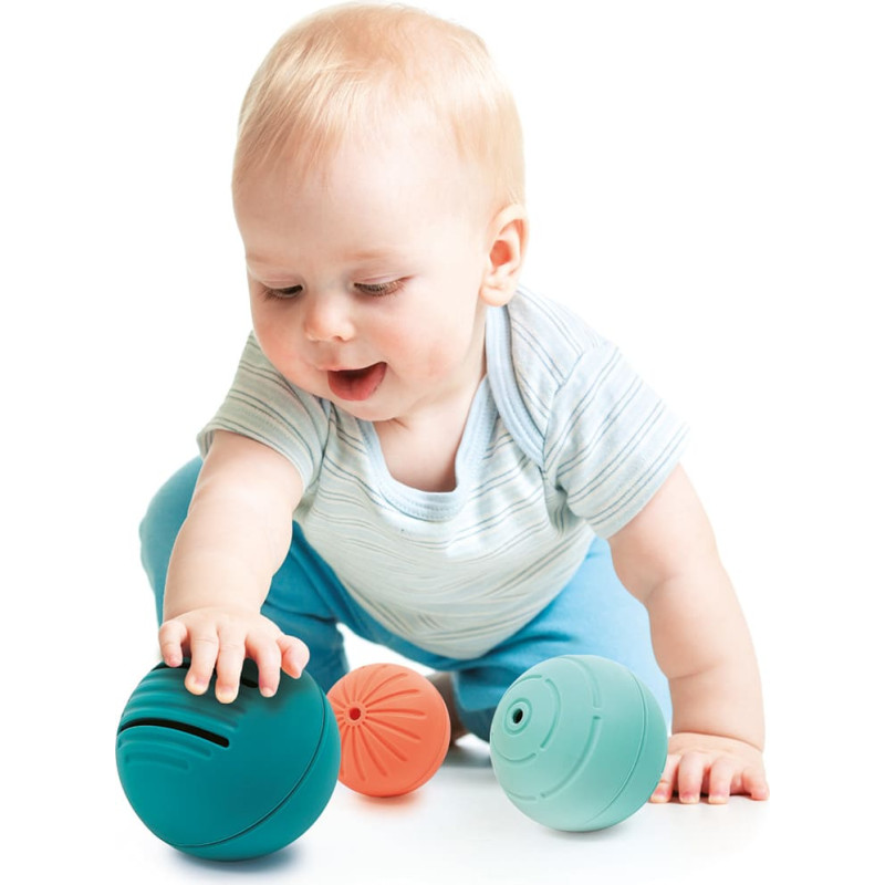 Kolm pehmet ja elastset palli. Iga pall on sobiva suurusega väikestele kätele ning oma ainulaadse tekstuuriga aitab lapsel avastada uusi puudutustunde, arendades samal ajal taktiilset tundlikkust ja silma-käe koordinatsiooni. Täiesti sobilik ka vannimänguks – jälgi, kuidas vesi voolab erineva suurusega aukudest mitmel moel. Valmistatud 100% silikoonist. Soovituslik vanus 6 kuud ja vanematele. Lihtne puhastada. Puhastamiseks pühkige niiske lapiga. Pallide mõõdud Ø 8,4 cm, Ø 6,9 cm ja Ø 5,3 cm. Pakendi mõõdud 11.50x26.70x8.60 cm. Toode kannab CE-märgist. Toodetud Hiinas,Loodud: SAS JBM, Ludi, Prantsusmaa.