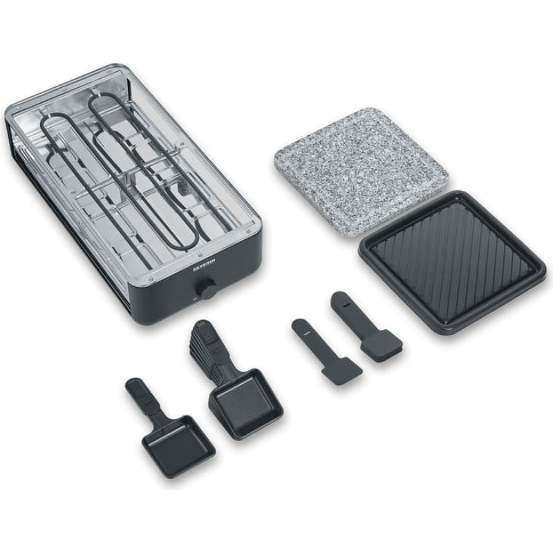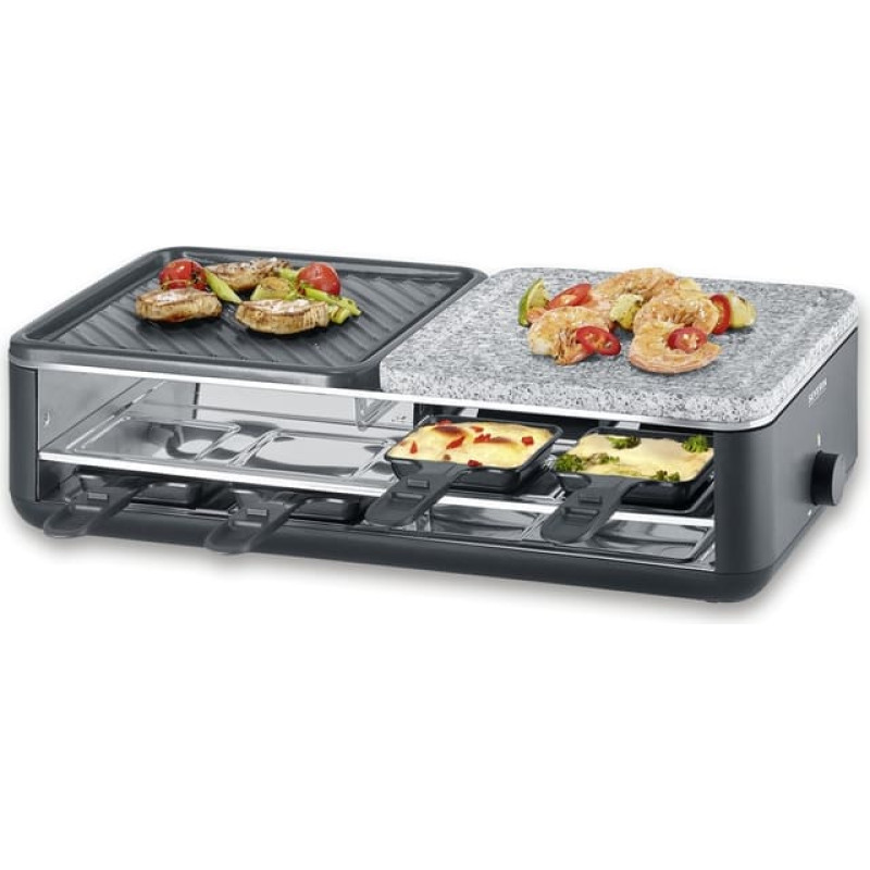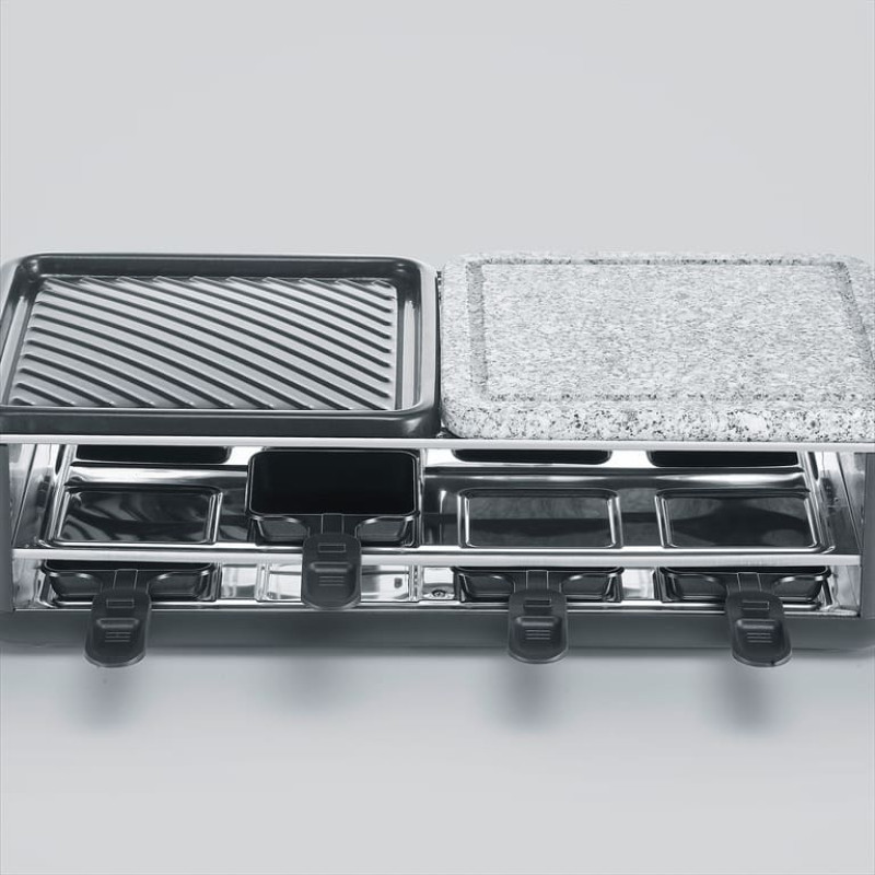 Raclette-grill 8 mittenakkuva kattega panniga, millel on klõps-stop-funktsioon. Kombinatsioon looduslikust kivist ja kvaliteetsest keraamilise kattega grillimispinnast, sobib suurepäraselt liha, kala või köögiviljade jaoks. Sisaldab parkimistaset kuumade või kasutamata pannide hoidmiseks. Muutuva temperatuuri seadistus LED-valgustuse ja eriti sügavate 20 mm pannidega optimaalseks täitmiseks.