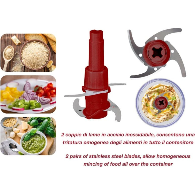Praktiline köögikombain 500 ml plastikust korpuse ja anumaga. Topeltpaarid roostevabast terasest lõiketerasid võimaldavad toiduaineid kogu anumas ühtlaselt tükeldada. Saab kasutada ainult ühe teraga. Blokeeriv turvasüsteem ja libisemiskindlad jalad tagavad stabiilsuse. Lihtne lahti võtta ja puhastada.