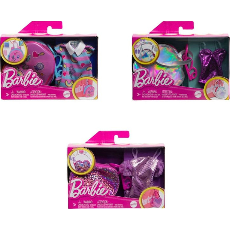 Need Barbie® riidekomplektid on ilusas ja pilkupüüdvas kotis, milles on kokku viis rõivaeset ja aksessuaari.