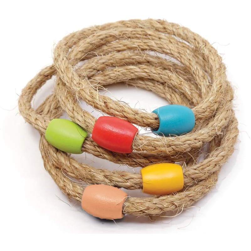 Naudi lõputut lõbu õues selle rõngaviskemänguga! Komplektis on kuus värvilist köierõngast ja kohandatav puidust alus, mis võimaldab mängida mitmel eri moel. Ohutu, keskkonnasõbralik ja hõlpsasti kangaskotti pakitav - ideaalne kaaslane piknikule, peole või vabaõhuseiklusele!
