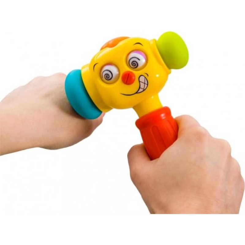 - smieklīga seja: sitot ar āmuru, viņa seja mainās - mēs stimulējam bērnu izpētīt šo procesu