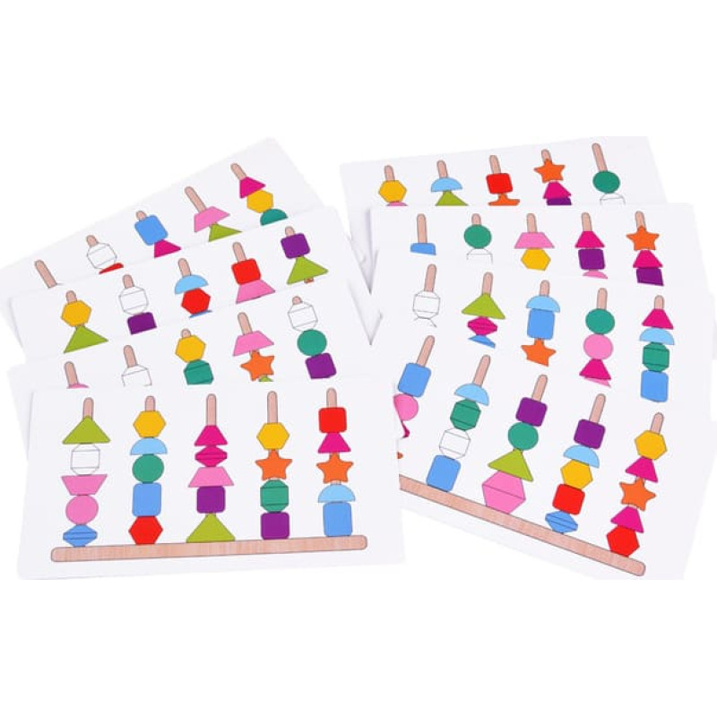 Koka izglītojoša rotaļlieta-puzle ļaus praktizēt daudzas prasmes vienlaikus. Tā pozitīvi ietekmē redzi un tausti, kā arī spēju atšķirt formas, krāsas, attīsta acu-rokas koordināciju un roku veiklību. Bērns ar koka puzli var spēlēties divos veidos - uzliekot kubiņus uz stabiņiem atbilstoši komplektā iekļautajām kartēm vai uztinot uz aukliņas. Klučiem ir bagātīgas, košas krāsas un tie noteikti piesaista bērnu uzmanību, mudinot viņus rotaļāties.
