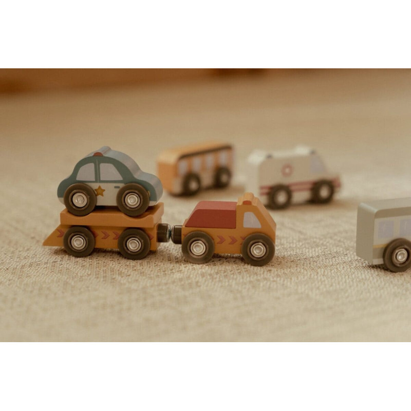 The city is always on the move! These wooden business and emergency vehicles are ready for action and smoothly ride the rails to provide help where needed. Send out the fire brigade, have the police patrol, or let the truck deliver goods. Designed for endless play fun with the Little Dutch Railway XL and expansion sets. Combine and create your own adventurous city! Dimensions: 33,2 x 40 x 24,5 cm Material: FSC wood Age: 2+ years Standard: EN-71-1-2-3