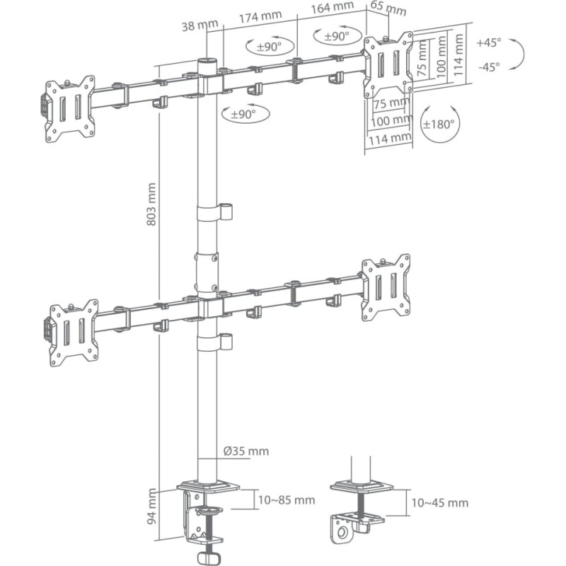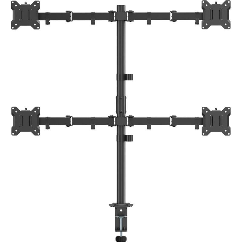 Lauakinnitus LCD-352/4-3 muudab iga tööruumi moodsaks, organiseeritud ja ergonoomiliseks. See toetab nelja monitori suurusega 17–32 tolli (VESA 75×75 / 100×100), kandevõimega kuni 10 kg ekraani kohta. Laia liikumisulatusega – kallutus +45°/-45°, pöörlemine +90°/-90° ja pöörlemine +180°/-180° – saab iga monitori täpselt teie ideaalse vaatenurga alla paigutada. 376 mm pikkuse käepideme ja 803 mm kõrguse postiga pakub see suurepärast paindlikkust mitme ekraaniga konfiguratsioonide jaoks, samas kui integreeritud kaablihaldus hoiab paigalduse puhta ja professionaalsena. Paigaldamine on lihtne kas lauaklambri (10–85 mm) või rõngaskinnituse (10–45 mm) abil. Eemaldatav VESA plaat muudab monitori paigaldamise kiireks ja lihtsaks. Elegantse musta viimistlusega terasest ja plastikust valmistatud LCD-352/4-3 sobib ideaalselt edasijõudnutele mõeldud multitegumtöötluseks, professionaalseteks tööjaamadeks, analüütilisteks seadistusteks, mängimiseks või loomingulisteks projektideks – ideaalne täiendus igale kaasaegsele tööruumile, mis nõuab maksimaalset tootlikkust.