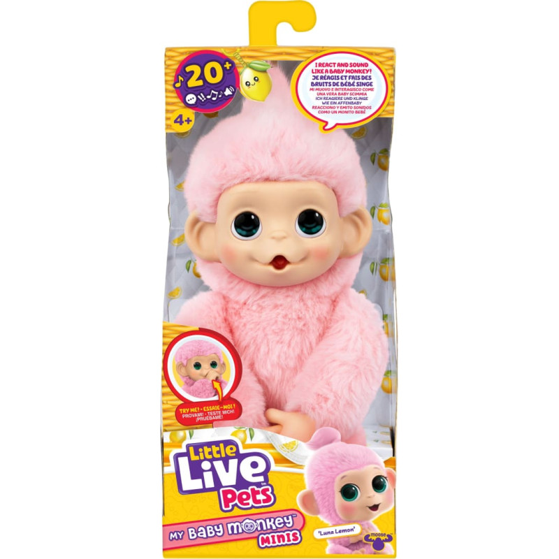 Little Live Pets My Baby Monkey Minis beebiahvil on üle 20 erineva heli ja reaktsiooni. Ta reageerib su puudutusele, teeb armsaid ahvihääli, oskab imeda pudelit, lutti või sõrme. Tänu haaravatele kätele ja jalgadele ning realistlikult pehmele karvkattele näeb ta välja, reageerib ja kõlab nagu päris ahvipoeg! Kokku saad koguda 3 armsat beebit – igal neist on unikaalsed aksessuaarid!