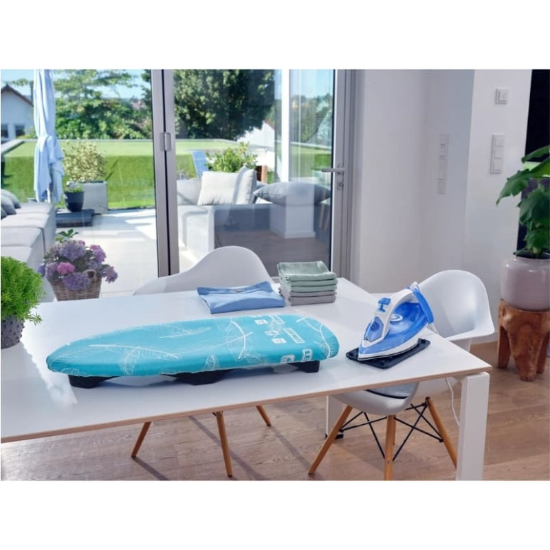 Air Board Table Compact der jebkuram galdam, ietilpst vismazākajā telpā, jo tā augstums ir tikai 9 cm, un piedāvā gludināšanas komfortu kā “liels” gludināmais dēlis. Tā pārvalkam ir īpaša Thermo Reflect tehnoloģija, kas atstaro gludekļa siltumu un tvaikus, nevis ļauj tiem iztvaikot caur gludināmo dēli. Tādā veidā veļa tiek gludināta no abām pusēm vienlaikus. 70 x 30 cm gludināmā virsma ir izgatavota no īpaši vieglas speciālas plastmasas; pleciem pieguļošā forma atvieglo kreklu un blūžu gludināšanu bez krokām. Neslīdošas, mīkstas kājiņas nodrošina drošu un stingru saķeri uz jutīgām virsmām. Kompakts galda gludināmais dēlis, kas ir ideāli piemērots veļas gludināšanai spontāni vai lietošanai kemperos, autofurgonos vai brīvdienu mājās. Thermo Reflect tehnoloģija padara šo gludināmo dēli ideāli piemērotu lietošanai ar standarta gludekļiem un tvaika gludekļiem.