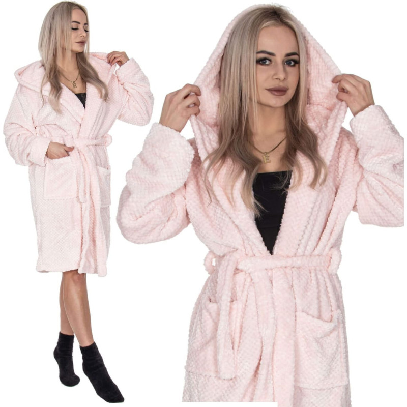 Materjal: polüester Tekstuur: karusnahk Roosa värv Suurus: L/XL Eelised: 2 mahukat taskut, suur kapuuts, vöörihm, riputusaas Mõõdud: Kogupikkus ca: 100 cm Laius kaenla alt ca: 60 cm Õla laius ca: 55 cm Varruka pikkus ca: 61 cm Varruka laius allservas: 15 cm Kapuutsi pikkus: 38 cm Lisainformatsioon: Pesta temperatuuril kuni 40°C Mitte valgendada Ei trummelkuivatust Mitte triikida Mitte keemiliselt puhastada