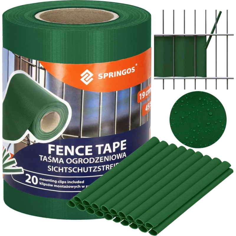 Kaubamärk: Springos® Materjal: PVC Kaal: 450 g/m2 Värv: tumeroheline Kaitse UV-kiirguse eest Lisaks: 20 kinnitusklambrit Klipi andmete parandamine: Materjal: polüetüleen Värv: tumeroheline Osade arv komplektis: 20 Mõõdud: Võrgu pikkus: 35 m Võrgu laius: 19 cm Võrgusilma paksus: 0,2 mm Kinnitusklambrite pikkus: u. 19 cm Klambri laius: 7,5 mm Klambrite kõrgus: 1,25 cm Ava klambrites: 5,5 mm