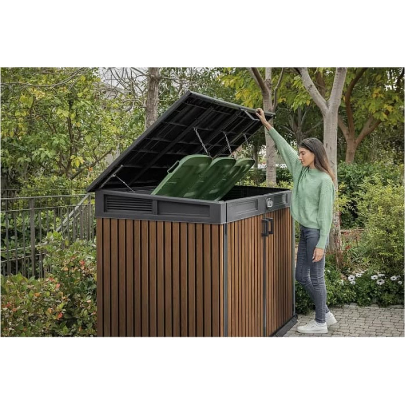 Uzglabāšanas šķūnītis ir izgatavota, izmantojot inovatīvu DecoCoat™ tehnoloģiju, kas ir izturīga pret laikapstākļiem. Tā nerūsē, neveido ieliekumus un nelobās. Šī ārkārtīgi modernais un izturīgais uzglabāšanas šķūnītis neprasa apkopi un ir viegli saliekams. Lai nodrošinātu maksimālu ērtību, tai ir slieksnis ērtai manevrēšanai. Hidrauliskie virzuļi un pret rūsu izturīgas metāla eņģes ar 180° atvēršanas leņķi nodrošina ērtu atvēršanu. Turklāt regulējami kronšteini plauktu uzstādīšanai ļauj pielāgot uzglabāšanas iespējas. Slēdzamas durvis nodrošina papildu drošību, un iebūvētā ventilācijas sistēma novērš nepatīkamu smaku uzkrāšanos. Tajā ir arī spraugas diviem 240 litru konteineriem vai trim 360 litru konteineriem. Ārējie izmēri (cm): 190 x 109 x 132,5 Iepakojuma izmēri (cm): 112 x 132 x 28 Neto svars (kg): 61,30