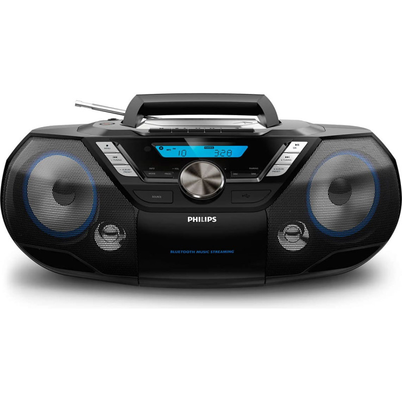 Philips portatīvā CD skaņas iekārta ir jaudīga un universāla skaņas sistēma, ko varat paņemt līdzi uz jebkuru vietu. Jūs varat brīvi klausīties savu mūziku no dažādiem avotiem — Bluetooth, USB, CD, kasetēm, DAB+ un FM radio.
